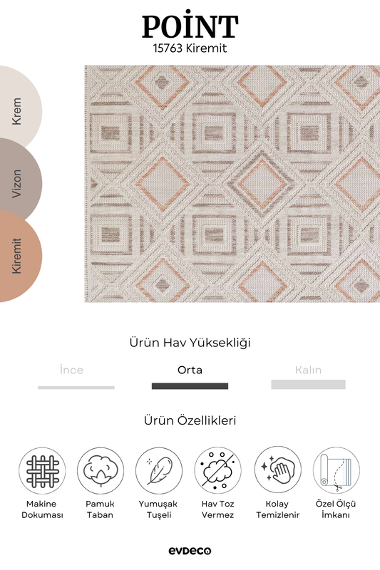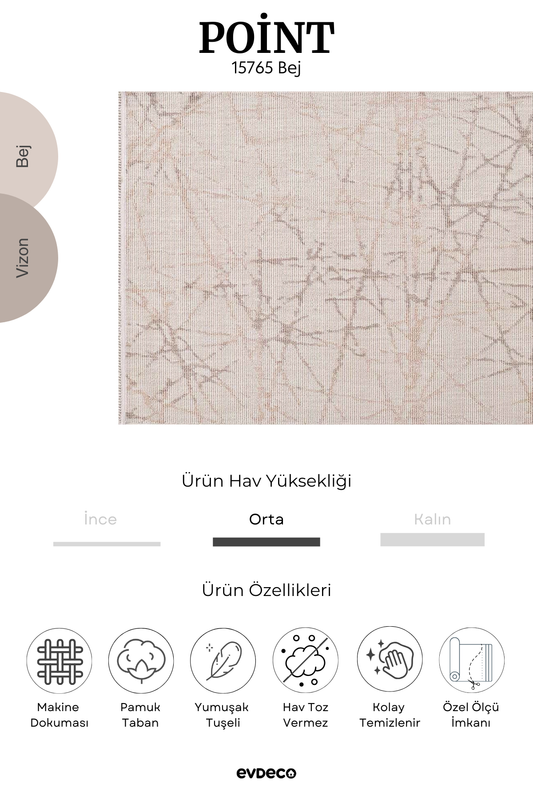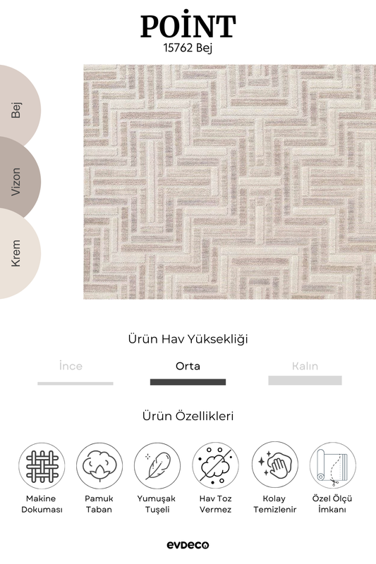 Point koleksiyonu, Vena koleksiyonunun zarif dokusunu ve modern çizgilerini taşıyan şık bir halı serisidir. Krem, bej ve vizon tonlarının öne çıktığı bu halılar, estetik ve konforu bir arada sunar.