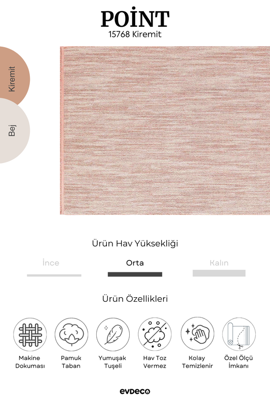 Point koleksiyonu, microfiber ve pamuk karışımından üretilmiştir. Bu malzeme kombinasyonu, halılara dayanıklılık ve yumuşaklık kazandırırken, uzun süreli kullanım sunar.